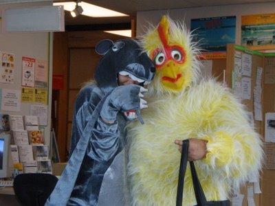 イースター前日に、チョコレートを持ってきてくれた取引先の皆さんが、何故かにわとりの格好をしてます。いいでしょ、勤務時間中にこんな格好で街を歩いてチョコ配ってるんだから。