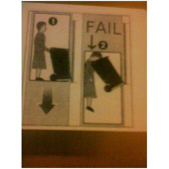 外国(つまりに本)に住んでるの人が見てもよく分からないと思いますが、1は大きなRubbishBin(つまり大型のゴミ箱)を押して、下りエレベーターに乗ってる女性の姿です。